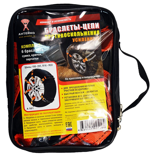 Браслет-цепь противоскольжения усил. (6шт.) перчатки,крючок, в сумке (р-р от 195/50 до 295/60) "АНТЕЙКО"