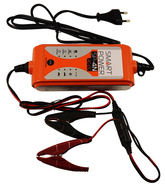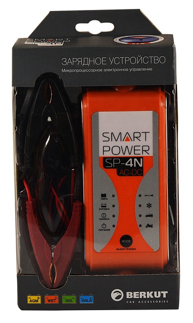 Портативное универсальное зарядное устройство BERKUT Smart Power SP-4N предназначено для обслуживания и зарядки всех типов свинцово-кислотных батарей емкостью до 80 А*ч и напряжением 12 В. Питание организуется от бытовой сети переменного тока 220 В. Главная особенность SP-4N — полная автоматика. Необходимо лишь задать подходящий режим, и устройство все сделает само. На выбор четыре режима работы: зарядка АКБ мотоцикла, зарядка АКБ автомобиля, зимняя зарядка автомобильного аккумулятора и десульфатация (восстановление) аккумулятора.